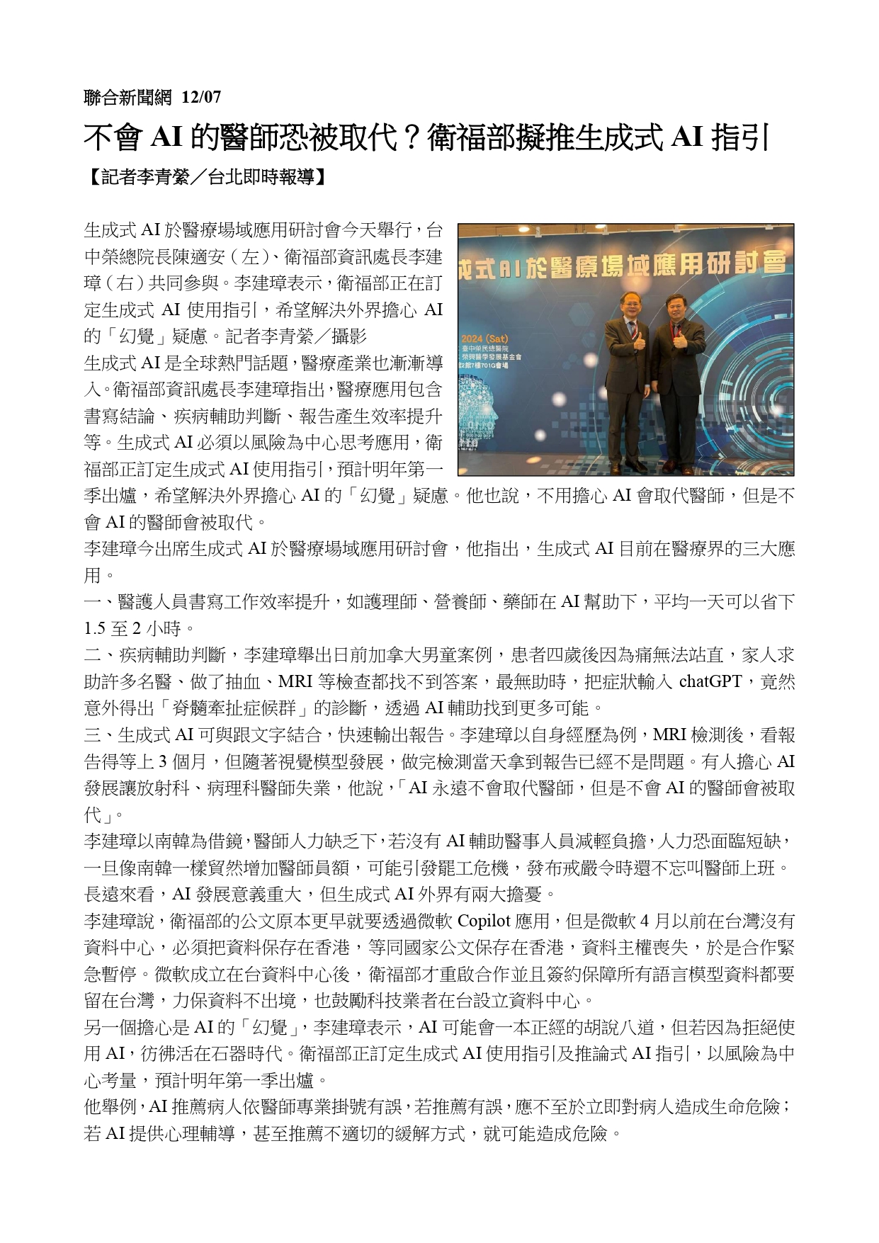 不會AI的醫師會被取代 臺中榮總辦理生成式AI研討會