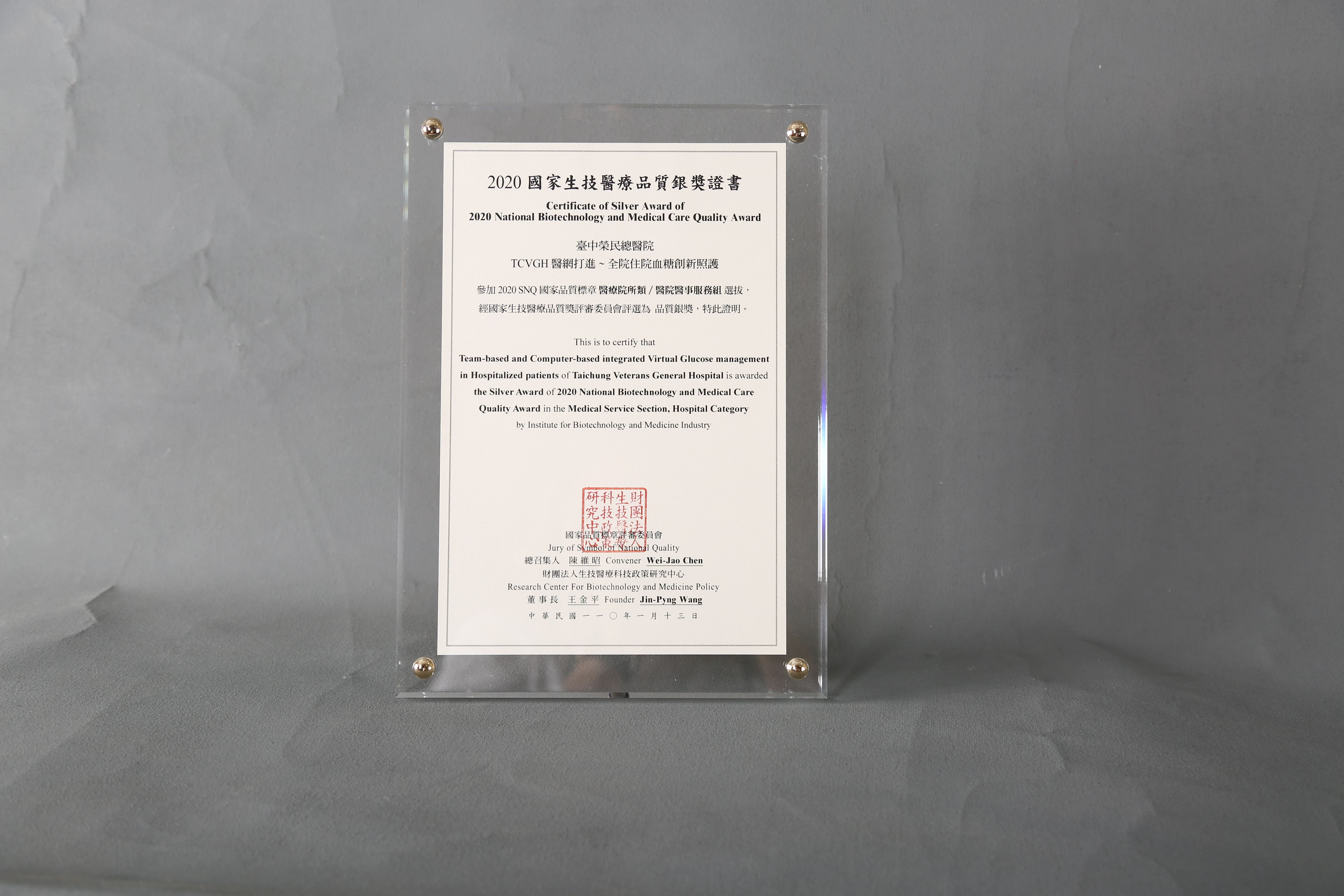 2020年國家生技醫療產業策進會-醫院醫事服務組-標章獎-TCVGH 醫網打進~全院住院血糖創新照護