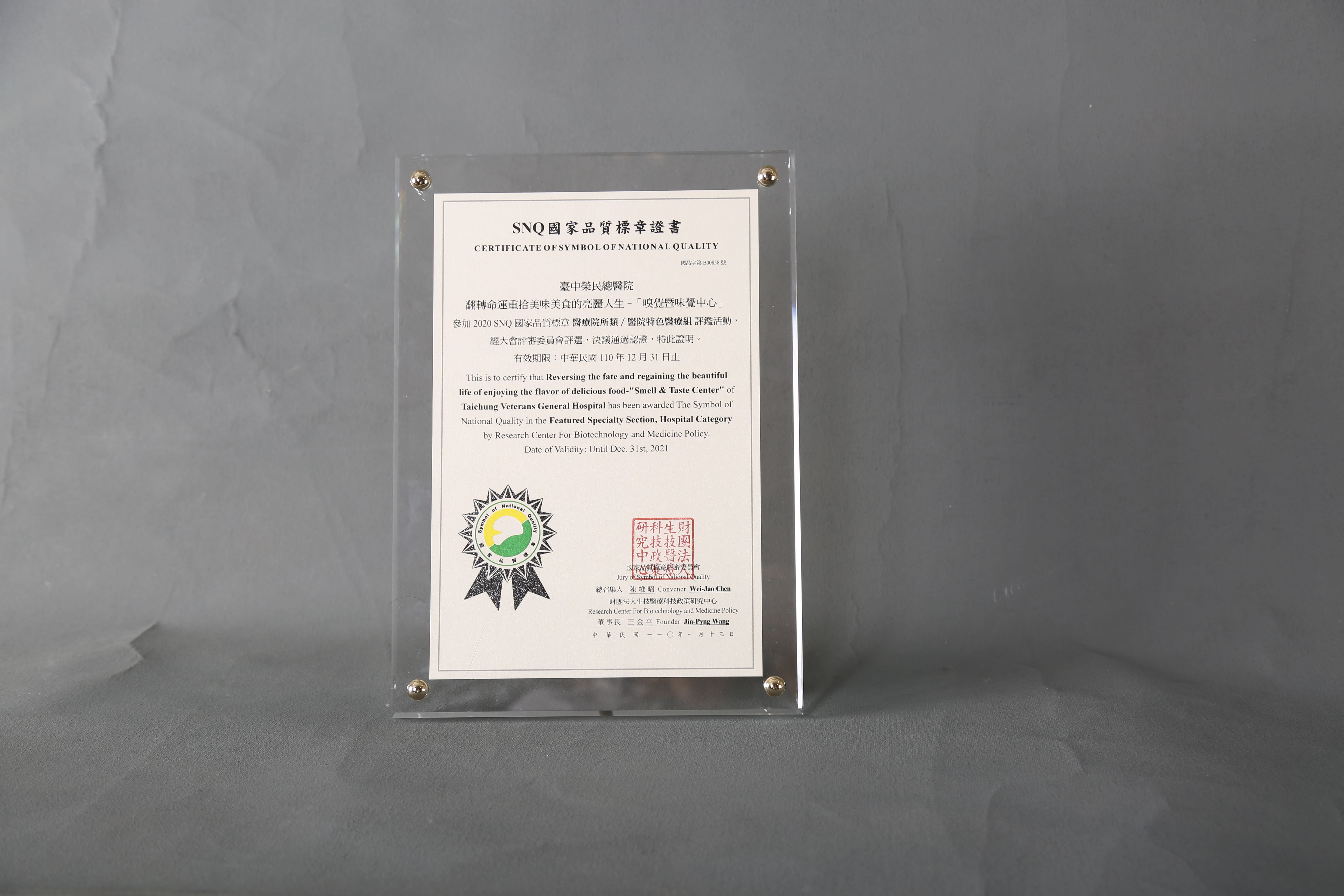 2020年國家生技醫療產業策進會-醫院特色醫療組-標章獎-翻轉命運重拾享受美味美食的亮麗人生-「嗅覺暨味覺中心」